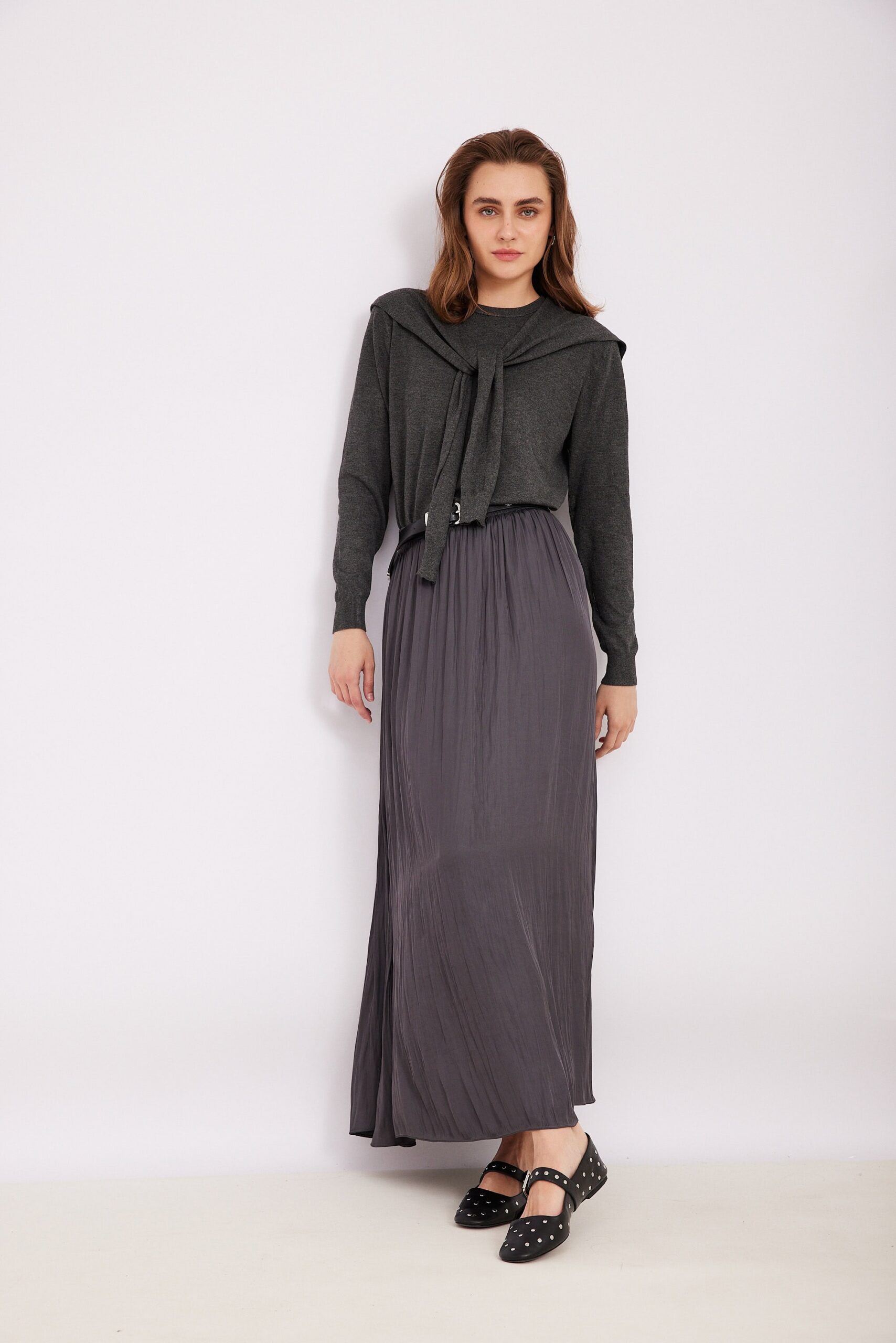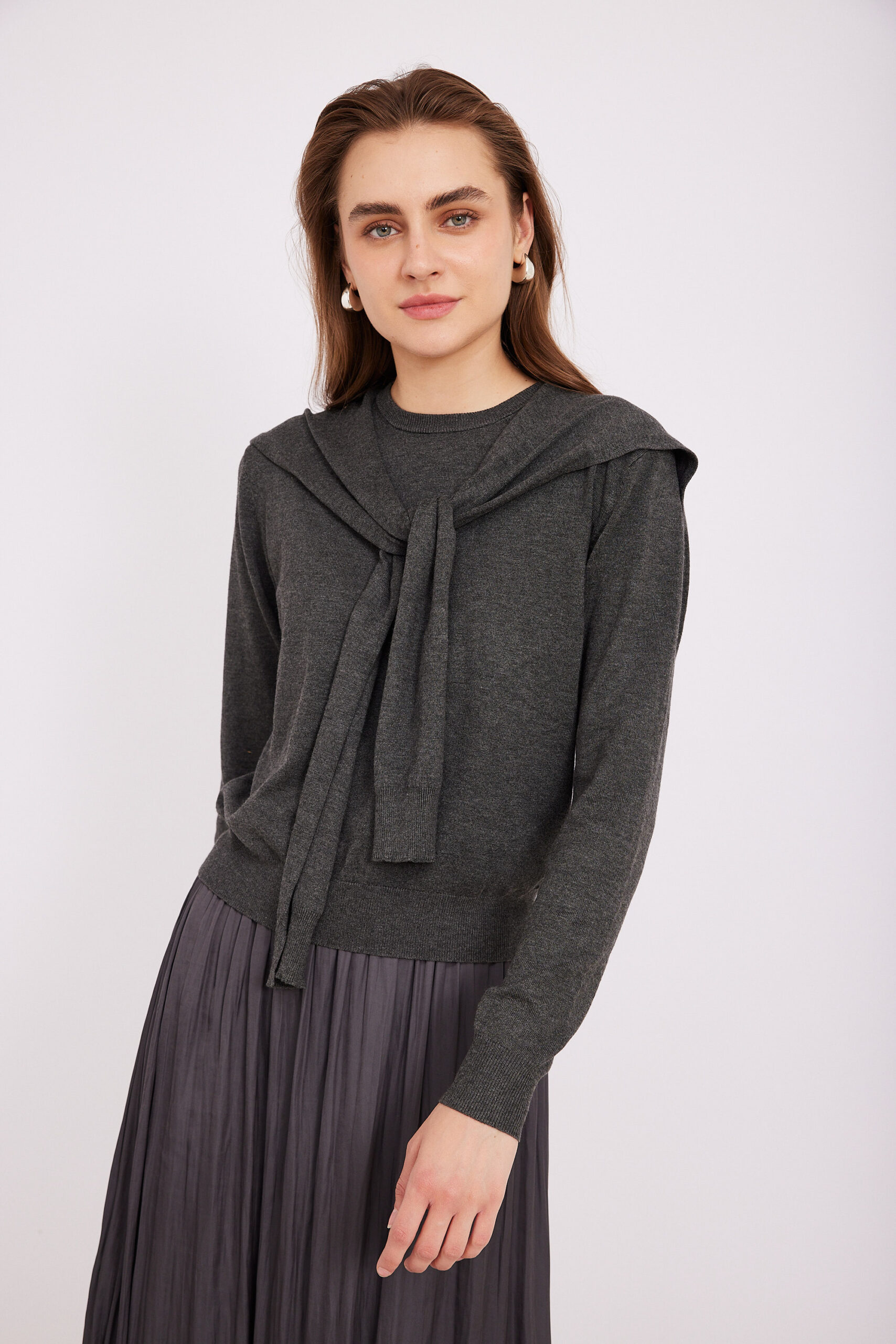 סריג אפור נעים ומחמם, בעל מגע רך וגזרה מודרנית. הסריג מגיע עם קשירה מיוחדת בקצוות, המדמה מראה של חולצה נוספת הקשורה סביב הכתפיים– פריט טרנדי המוסיף סטייל לכל הופעה